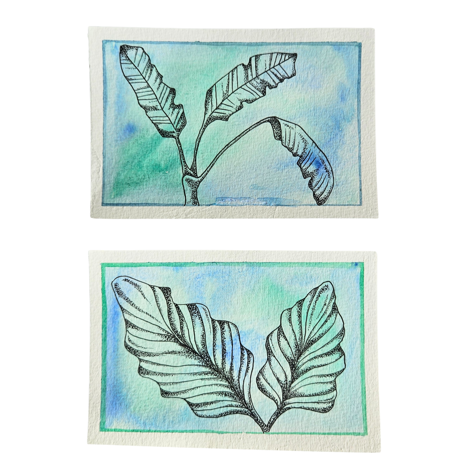 Botanical style illustration done in pen and ink, on a watercolour background.